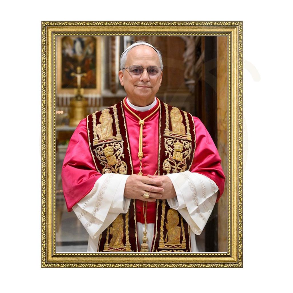 This beautiful portrait of Pope Leo XIV comes inside a Classic Gallery wood frame with an ornate inner bead. Framed Print available in two sizes.